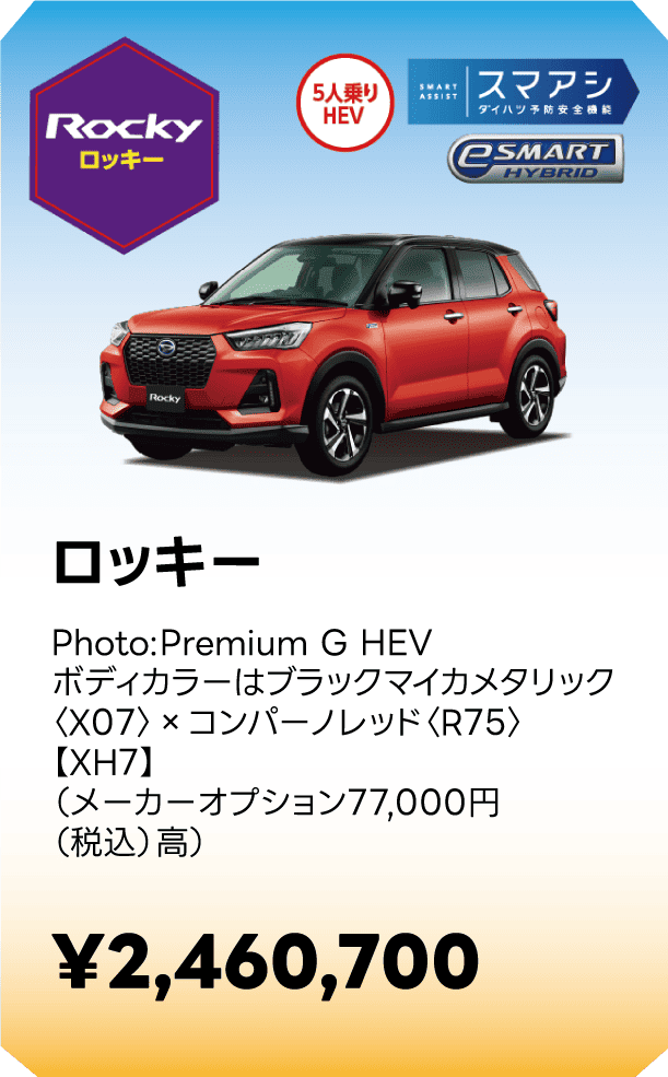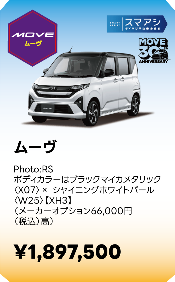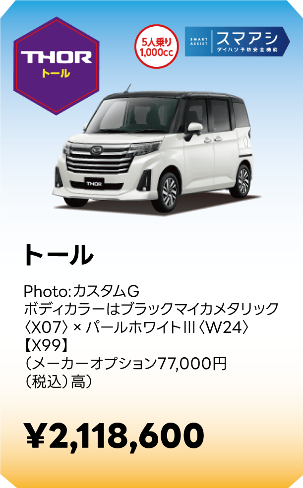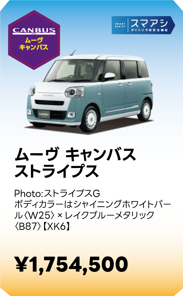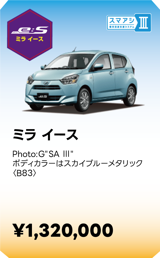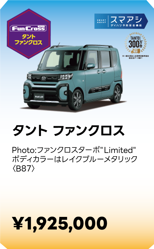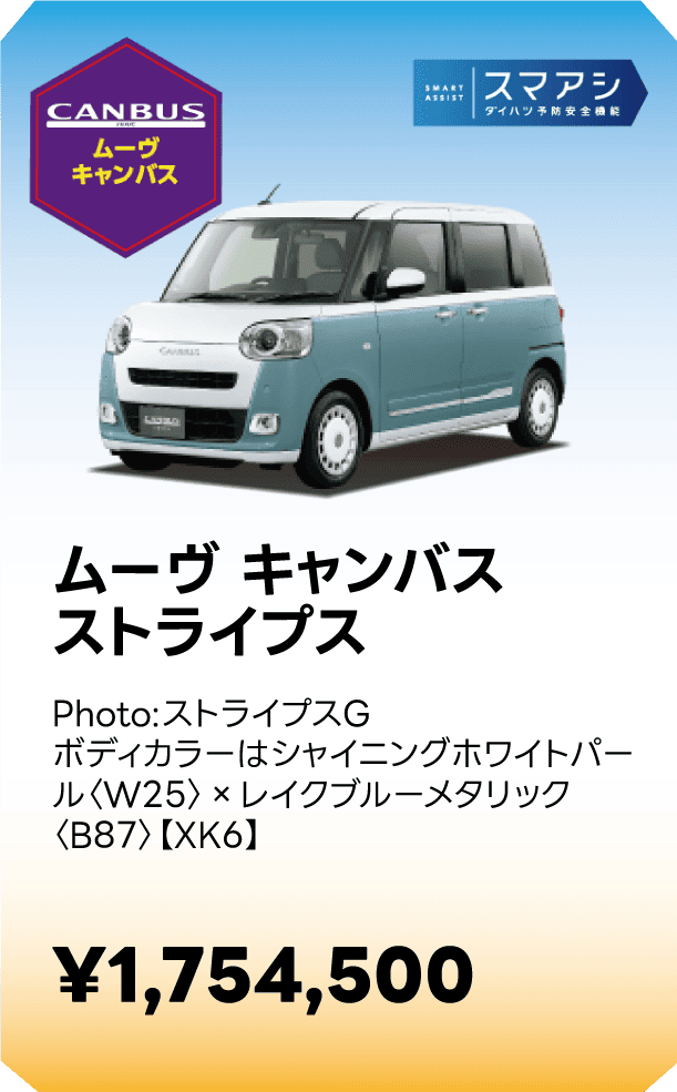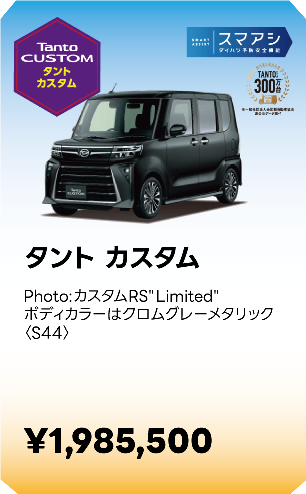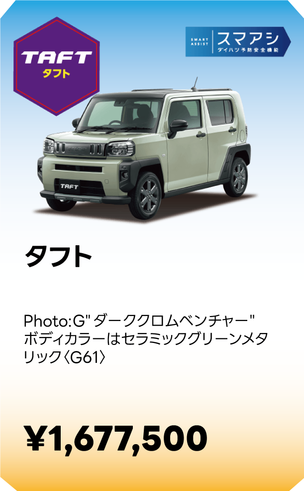 ■スマートアシストに頼った運転は絶対に行わないでください。スマートアシストは、ドライバーの判断を補助し、事故被害や運転負荷の軽減を目的としています。脇見運転やぼんやり運転などドライバーの前方不注意を防止したり、悪天候時の視界不良下での運転を支援する装置ではありません。また、あらゆる状況での衝突を回避するものではありません。運転時は常に先行車や歩行者との距離や周囲の状況、運転環境に注意して必要に応じてブレーキペダルを踏むなど距離を保ち、安全運転を心がけてください。■スマートアシストの認識性能・制御性能には限界があります。ドライバーの運転操作、急カーブ、急勾配、雨等の道路状況、および天候によっては、システムが作動しない、または作動が遅れる場合があります。■雪、濃霧、砂嵐の場合や、トンネル内、夜間、日射しの状況によってはステレオカメラ、ソナーセンサーが障害物などを正常に認識できず、適切に作動しない場合があります。■作動条件下であっても、システムが作動しない場合があります。■このほか、スマートアシストについて重要な注意事項が記載されておりますので、詳しくは取扱説明書をご覧ください。■スマートアシストの詳細は販売会社にお問い合わせください。■車種やグレードにより、装備内容や作動条件が異なる場合があります。